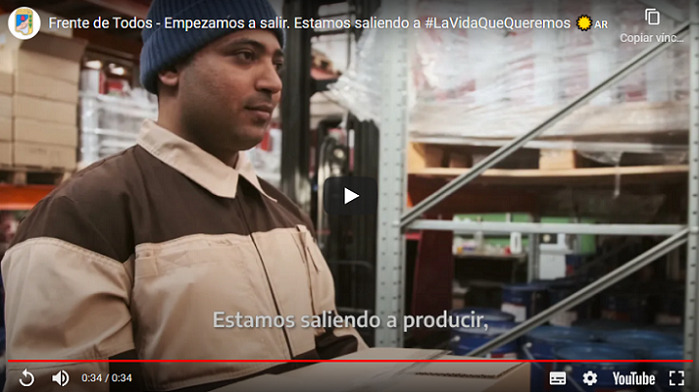 «Estamos empezando a salir, estamos empezando a trabajar, estamos empezando a estudiar. A cumplir nuestros sueños. Estamos empezando a salir a la vida, estamos empezando a salir a pasear, estamos saliendo a producir. A construir, a reactivar, a renovar», repite la voz en off del spot en un mensaje que estuvo en línea con una de las frases del presidente Alberto Fernández pronunciada desde la fábrica Queruclor de Garín, en la que prometió: «Volveremos a ser felices».