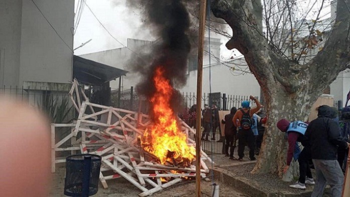 El grupo de violentos, que fue identificado como perteneciente al grupo piquetero «Movimiento de los Trabajadores Revolucionarios (MTR)», prendió una fogata cerca de las rejas del perímetro del edificio y lanzaron piedras a los efectivos policiales, quienes desde el otro lado del perímetro dispararon balas de goma para dispersarlos.