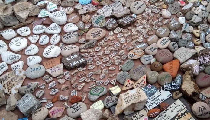 Un homenaje a las víctimas mortales que dejó la pandemia de coronavirus se llevó a cabo hoy en la Plaza de Mayo y frente a la Residencia oficial de Olivos, donde los asistentes dejaron piedras grabadas con los nombres de muchos de los fallecidos.
