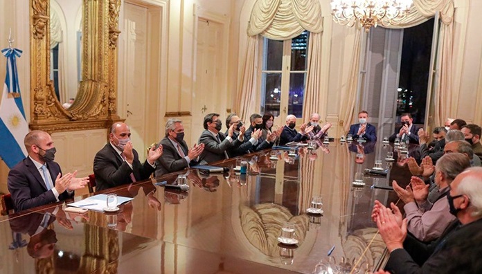 El Presidente se reunió con Héctor Daer (CGT), Hugo Yasky (CTA), Ricardo Peidro (CTAA), y el titular de la Unión Industrial Argentina (UIA), Daniel Funes de Rioja, acompañado por el jefe de Gabinete, Juan Manzur; los ministros de Trabajo, Claudio Moroni; de Economía, Martín Guzmán; de Desarrollo Productivo, Matías Kulfas, y de Desarrollo Social, Juan Zabaleta, y la secretaria Legal y Técnica, Vilma Ibarra.