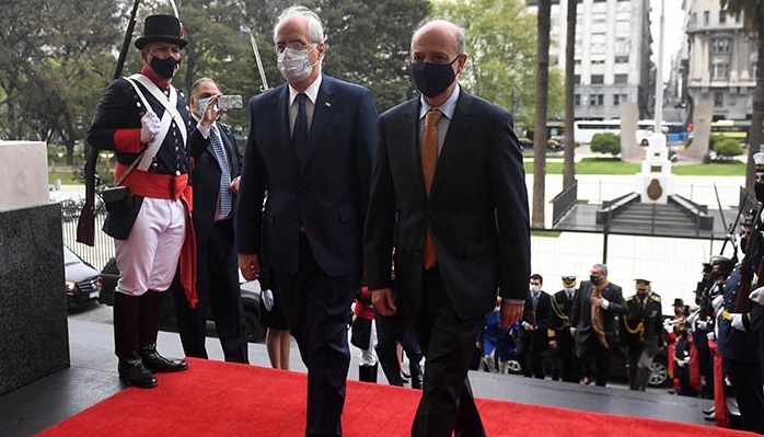 Taiana y el ministro de Uruguay, Javier García Duchini, llegaron juntos al edificio a las 9:50 de la mañana, y fueron recibidos por una formación de personal militar de distintas fuerzas.