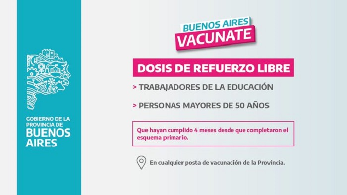 El gobernador de la provincia de Buenos Aires, Axel Kicillof, anunció que desde este miércoles habrá tercera dosis libre de la vacuna contra el coronavirus para docentes bonaerenses y mayores de 50 años y precisó que se llevará a cabo una campaña de inmunización en 2.600 escuelas para aumentar la vacunación de los alumnos de cara al inicio del ciclo lectivo.