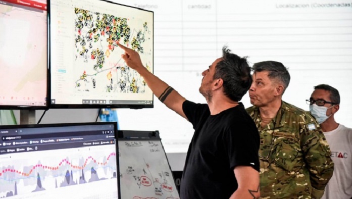 Esta mañana, el funcionario nacional, junto a la secretaria de Coordinación Militar en Emergencias del Ministerio de Defensa, Inés Barboza, sobrevolaron la zona de San Alonso y estuvieron en el campamento de brigadistas ubicado en la localidad de San Miguel, donde funciona el Comando Operativo de Emergencias del Servicio Nacional de Manejo del Fuego.