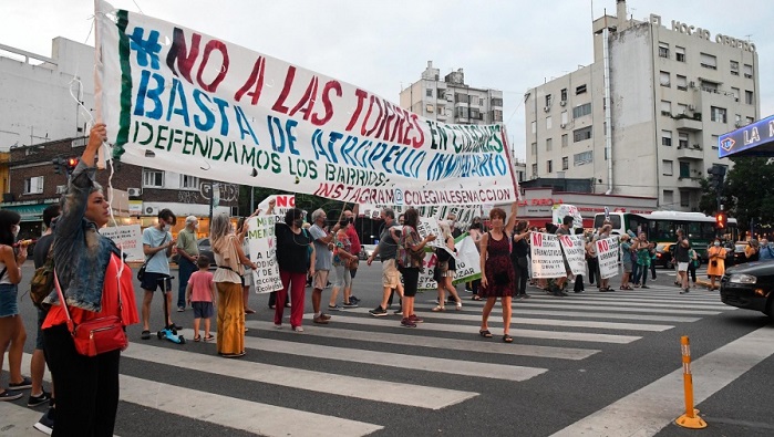 Vecinos autoconvocados y organizaciones sociales de Buenos Aires desplegaron carteles con leyendas como «Faltan parques. Sobran torres», «Basta de destruir nuestros barrios» en protesta al nuevo código urbano elaborado por el Gobierno porteño en 2018.