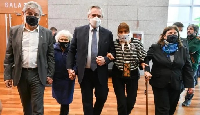 Junto al Presidente estuvieron también en el escenario Lita Boitano, la presidenta de Familiares de Desaparecidos y Detenidos por Razones Políticas, y Taty Almeida, referente de Madres de Plaza de Mayo Línea Fundadora.