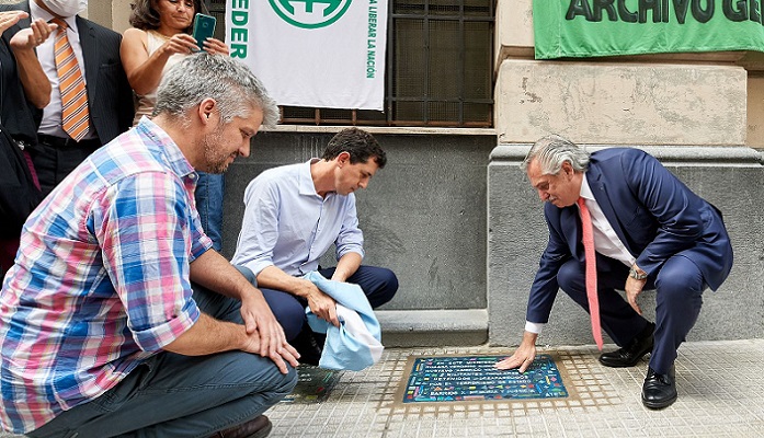 El presidente Alberto Fernández y el ministro del Interior, Eduardo «Wado» de Pedro, descubrieron este martes una baldosa en la entrada de esa cartera, en el barrio porteño de San Nicolás, en memoria de Gustavo Américo Varela y Roxana Verónica Giovannoni, trabajadores de ese organismo que fueron detenidos-desaparecidos durante la última dictadura cívico-militar.