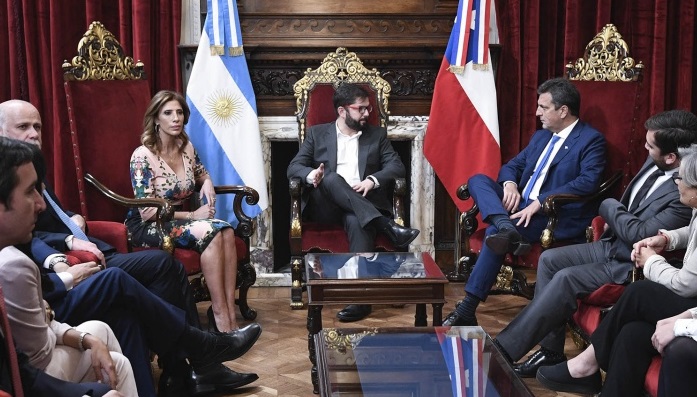 El presidente de Chile, Gabriel Boric, visitó este lunes el Congreso Nacional, donde fue recibido por el titular de la Cámara de Diputados, Sergio Massa, y la presidenta provisional del Senado, Claudia Abdala Ledesma, con quienes abordó las relaciones bilaterales entre ambas naciones y la necesidad de fortalecer los vínculos de los Parlamentos de los dos países.