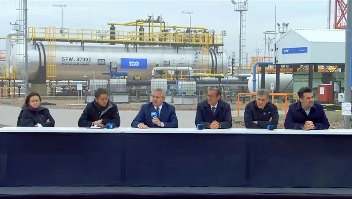 Fernández encabezó este jueves en el bloque Loma Campana de la empresa YPF, en el corazón de Vaca Muerta, un acto junto al gobernador de Neuquén, Omar Gutiérrez; el gobernador bonaerense, Axel Kicillof; el secretario de Energía, Darío Martínez; el presidente de YPF, Pablo González, y la directora ejecutiva de la Fundación YPF, Ofelia Cédola.