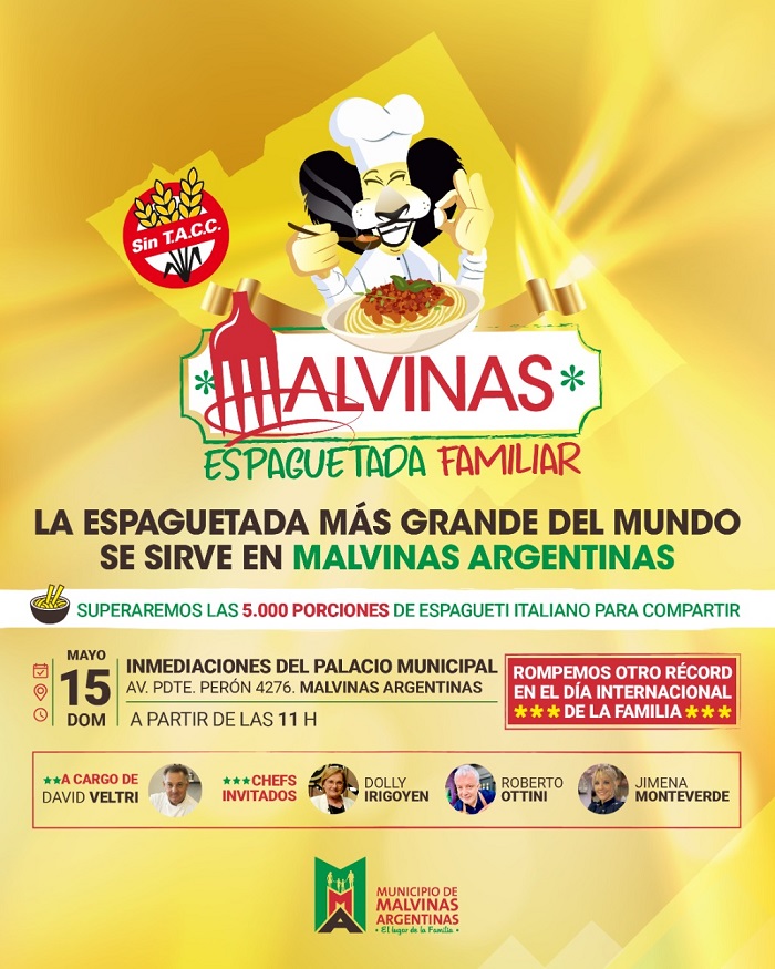 El municipio de Malvinas Argentinas se propuso romper un nuevo récord en el Día Internacional de la Familia: la espaguetada más grande del mundo, la cual se realizará el domingo 15 de mayo desde las 11 de la mañana en las inmediaciones del Palacio Municipal (Av. Pdte. Perón 4276, ciudad de Malvinas Argentinas).