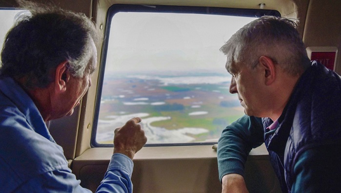 Domínguez realizó una recorrida área sobre la región afectada y luego realizó una caminata por zonas inundadas.