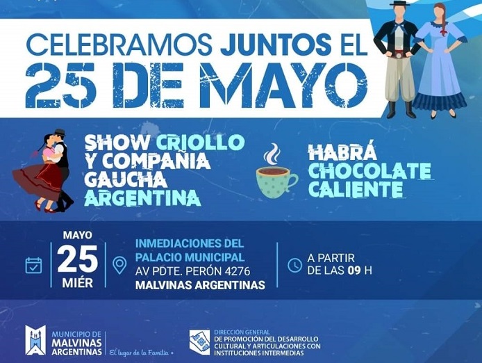 El 25 de mayo es una de las fechas patrias más importantes en la República Argentina, día en que se conmemora la Revolución de Mayo. Para celebrar, el municipio de Malvinas Argentinas preparó para este año diferentes espectáculos culturales que tendrán lugar en tres puntos de la comuna. Ellos son: las inmediaciones del Palacio Municipal, la Plaza Itatí, y en la CCA (Casa Cultura y Arte).