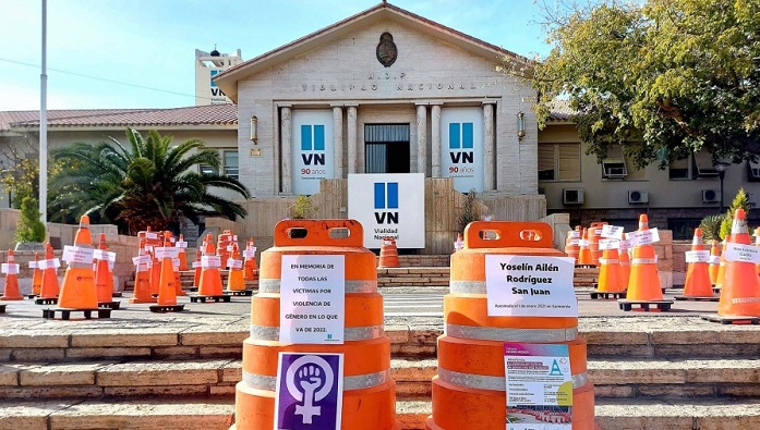 Vialidad Nacional instaló 113 conos de seguridad vial en 17 distritos ubicados a lo largo del país al cumplirse siete años de las movilizaciones por Ni Una Menos, con el fin de visibilizar los crímenes de odio por motivos de género registrados en Argentina entre enero y mayo de 2022.