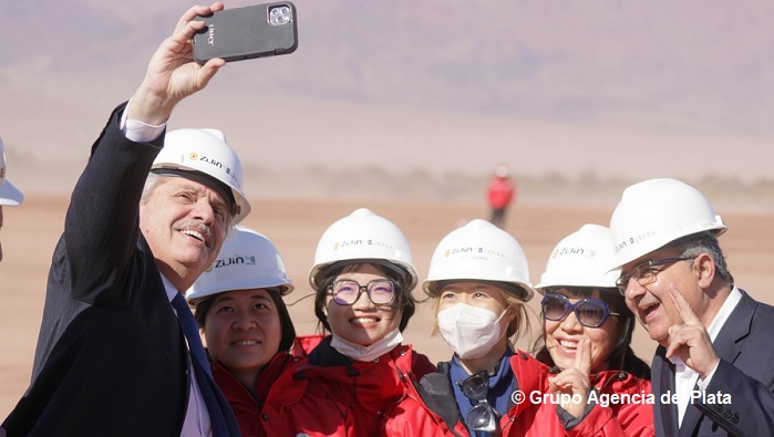 El Presidente encabezó una recorrida por la localidad de Fiambalá y allí visitó, junto al gobernador local, Raúl Jalil, y el mandatario de La Rioja, Ricardo Quintela. la planta de carbonato de litio de la minera china Zijin Mining y un emprendimiento hotelero inaugurado el mes pasado.