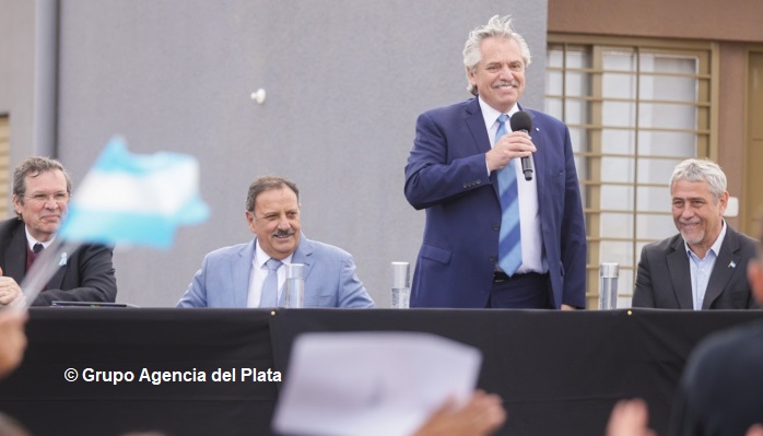 Fernández estuvo acompañado por los ministros de Desarrollo Territorial y Hábitat, Jorge Ferraresi; Cultura, Tristán Bauer; y Educación, Jaime Perczyk; la vicegobernadora, Florencia López; el ministro de Vivienda, Tierras y Hábitat Social provincial, Ariel Puy Soria, y el intendente local, Rodrigo Brizuela y Doria.