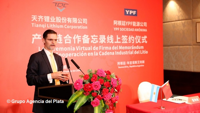 En la firma del acuerdo, realizada en la provincia de Sichuan en el marco del 50 aniversario de las relaciones bilaterales, el embajador argentino en China agradeció al presidente de YPF, Pablo González, y afirmó que “China es un socio estratégico para el desarrollo económico de nuestro país y es un líder a nivel mundial en litio, prueba de ello es que cuando uno mira los principales jugadores del mercado a nivel mundial son todas empresas de origen chino. A su vez, Argentina es un punto del llamado Triángulo de Litio que posee en total más de la mitad de las reservas de este oro blanco”.