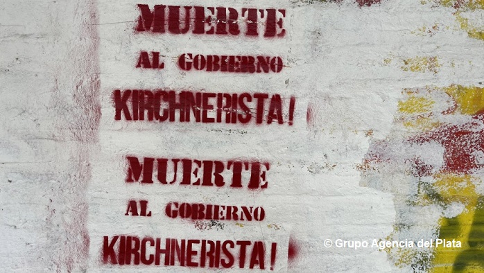 Las pintadas con la consigna «muerte al gobierno kirchnerista» aparecieron esta mañana a lo largo de la Diagonal 73 desde Plaza Rocha hasta Plaza Matheu y también por calle 2 desde 65 a 71, en las cercanías de la Facultad de Periodismo de la Universidad Nacional de La Plata (UNLP).