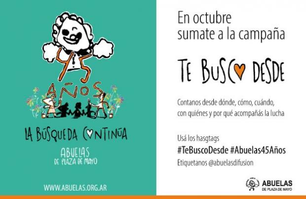 Al cumplir 45 años desde su fundación, las Abuelas de Plaza de Mayo lanzaron #TeBuscoDesde, una campaña donde invitan a compartir en redes sociales fotos, audios, videos y dibujos que respondan «dónde, cómo, cuándo, con quiénes y por qué» buscan a los nietos apropiados durante la última dictadura.
