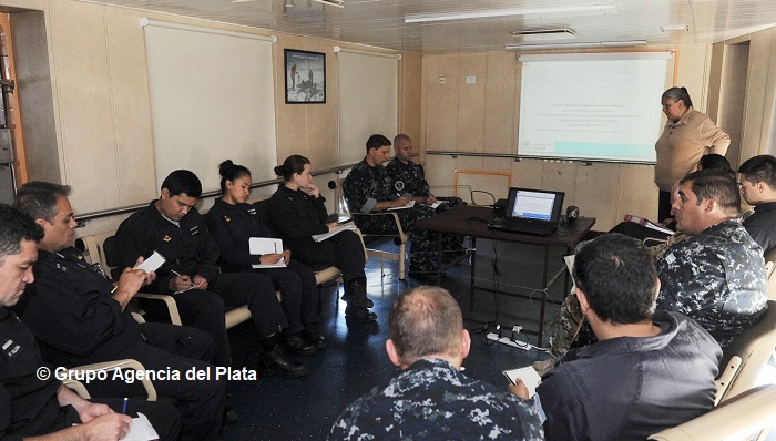 «En este momento tenemos más de 20 cursantes en el buque para capacitar», indicó a Télam la coordinadora, en medio de los preparativos previos a dar una de sus exposiciones en las que participaron suboficiales hombres y mujeres.