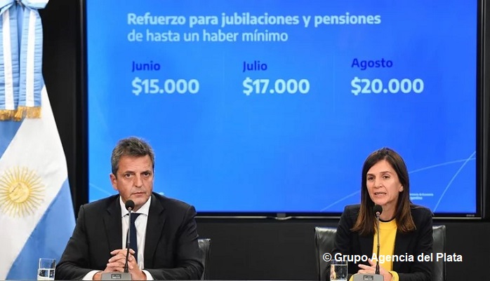 El ministro de Economía, Sergio Massa, y la directora ejecutiva de Anses, Fernanda Raverta, anunciaron el aumento del 20,92% de las jubilaciones y un refuerzo para los haberes mínimos de $ 15.000 en junio, $ 17.000 en julio y $ 20.000 en agosto. Asimismo, en junio se pagará el medio aguinaldo, por lo que un jubilado de la mínima percibirá $ 121.407.