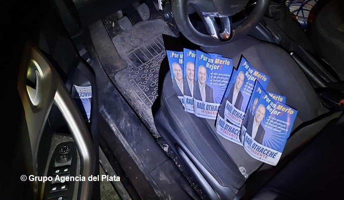 Dentro del vehículo en cuestión también se encontraron panfletos de partido político “Crecer Merlo”, liderado por el ex Intendente de Merlo Raúl Othacehé. Al momento de la requisa, personal policial encontró un envoltorio con marihuana, por lo que procedieron a la detención del conductor y al secuestro del vehículo.