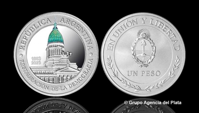 Junto al edificio del Congreso se lee «1983», fecha que se conmemora, y «2023», el año de acuñación.