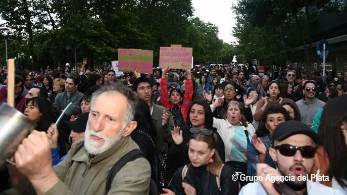 Un grupo de manifestantes se congregó este viernes en los alrededores del céntrico teatro Roxi de Mar del Plata, a donde acudió el presidente Milei para ver la obra «Fátima 100%», de su pareja Fátima Flórez, para protestar contra el DNU y la «ley ómnibus» que buscan generar fuertes reformas al Estado.