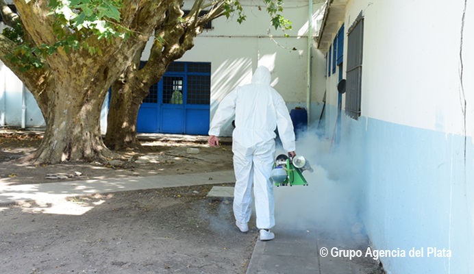 Por un trabajo de la Dirección General de Escuelas a través del Consejo Escolar, en conjunto con el municipio de Malvinas Argentinas a través de la Subsecretaría de Educación, se están fumigando todas las escuelas del distrito.