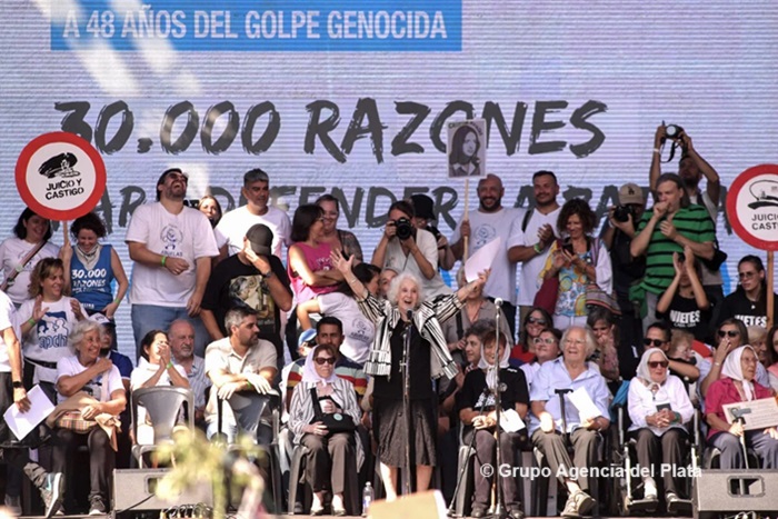 “A 48 años del golpe genocida, volvemos a reunirnos en la Plaza de Mayo y todas las plazas del país. Llegamos hasta acá, como siempre, para gritar bien fuerte: ¡SON 30.000! ¡ESTÁN PRESENTES! ¡FUE GENOCIDIO! ¡Y ESTE PUEBLO YA DIJO NUNCA MÁS!”