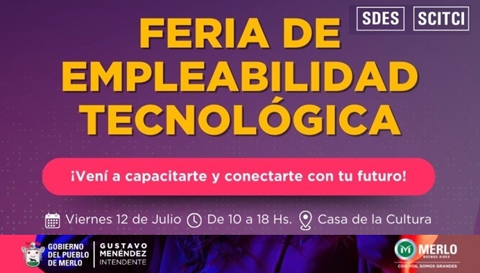 En el municipio bonaerense de Merlo a cargo del intendente Gustavo Menéndez vecinos y vecinas podrán participar de la Feria de Empleabilidad Tecnológica, una jornada en la que se dictarán charlas y cursos tecnológicos gratuitos. Se realizará el viernes 12/7 de 10 a 18 hs. en la Casa de la Cultura, ubicada en Av. Calle Real y Padre Espinal.