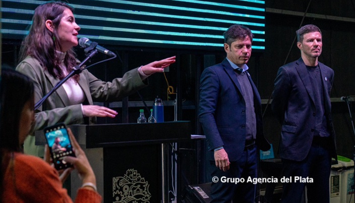 La intendenta Mariel Fernández, junto al gobernador Axel Kicillof y el ministro Augusto Costa.