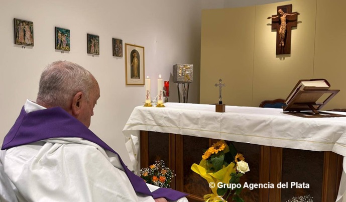 La Oficina de Prensa de la Santa Sede difunde una imagen del Pontífice en oración, después de concelebrar la Eucaristía esta mañana. Es el primero desde la hospitalización el 14 de febrero. Las condiciones de Francisco se mantienen estables, continúan las terapias y la fisioterapia respiratoria y motora.
