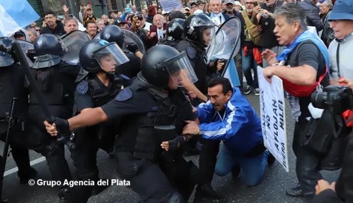 Y precisa: “Luego de que las fuerzas de seguridad cargaran contra los manifestantes, el ministerio de Seguridad aseguró que hubo al menos 124 detenidos. Además, se conoció que un fotógrafo, Pablo Grillo, salió gravemente herido, sufriendo una fractura de cráneo como resultado de un golpe directo con un gas lacrimógeno disparado por la Policía, y hoy lucha por su vida”.
