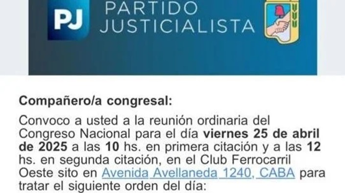La Convocatoria remitida a los congresales peronistas para el viernes 25 tiene una primera citación para las 10 de la mañana y una segunda para las 12. El Orden del Día consta de cuatro puntos, los dos primeros formalidades partidarias: comisión de poderes y la aprobación de estados contables del ejercicio 2024. El tercero se refiere a las intervenciones resueltas semanas atrás en Salta y Misiones y la prorrogada en Jujuy y, el cuarto tratará la normalización del PJ en Corrientes.