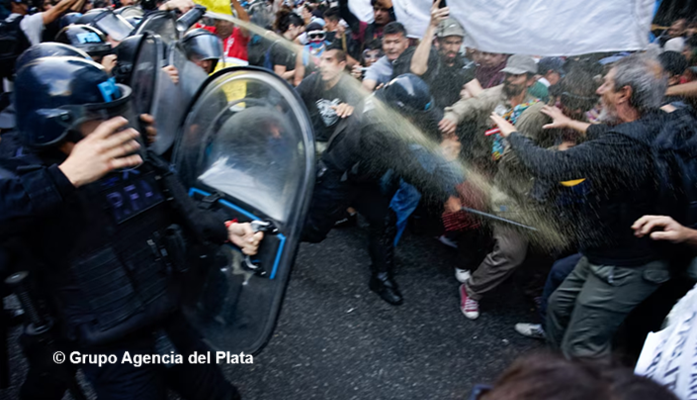 En esta oportunidad, la situación se tornó violenta alrededor de las 16 horas, cuando efectivos de la Policía Federal buscaban evitar que los manifestantes ocupen la Avenida Rivadavia, que se encuentra lindera al Congreso de la Nación. Una vez sobre la vereda, los agentes continuaron arrinconando a los manifestantes y a los trabajadores de prensa contra el edificio anexo de Diputados, lanzándole gas pimienta.
