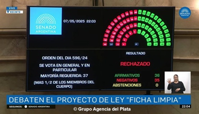 A las 22 horas de este miércoles, el Senado de la Nación rechazó el proyecto de Ley de Ficha Limpia al no alcanzar los votos necesarios para su aprobación. Si bien 36 senadores votaron a favor de la iniciativa, 35 se manifestaron en contra, y el proyecto no prosperó debido a que requería mayoría especial por tratarse de una modificación a la Ley de Partidos Políticos.
