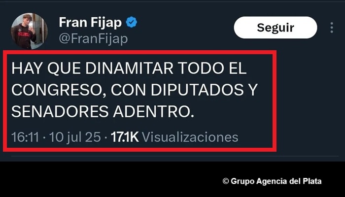 Por su parte, @ElTrumpista llamó a una “milicia popular armada” y difundió un video ficticio de una explosión en el recinto del Senado, mientras que Fran Fijap dijo que “hay que dinamitar todo el Congreso, con diputados y senadores adentro”.