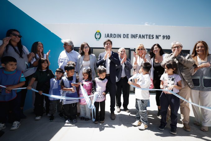 Durante la jornada, Kicillof y la directora general de Cultura y Educación, Flavia Terigi, inauguraron el nuevo edificio del Jardín de Infantes N°910. El establecimiento responde a una necesidad histórica de la comunidad y cuenta con tres aulas con baños incorporados, cocina, SUM y patio.